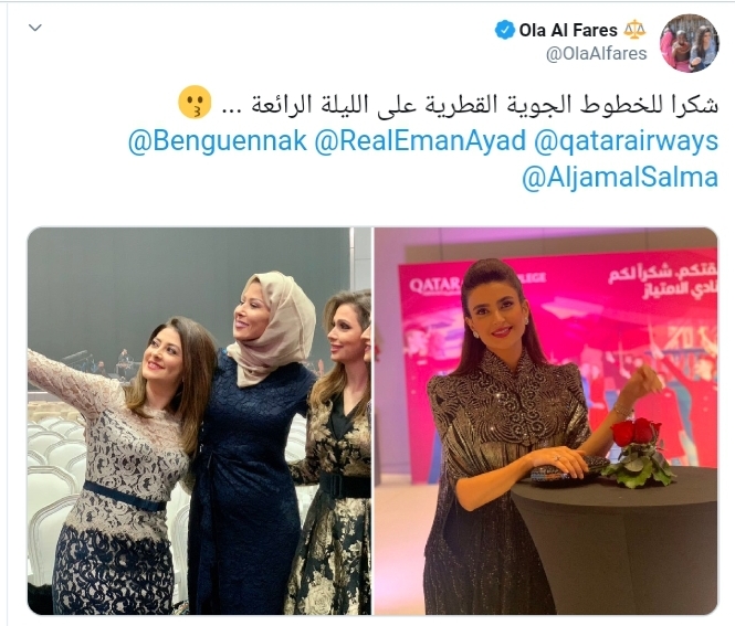وقالت في تغريدتها شكرا للخطوط الجوية القطرية على الليلة الرائعة وتظهر برفقتها ، إعلاميات منهن خديجة بن قنة، وإيمان عياد، سلمى الجمل.